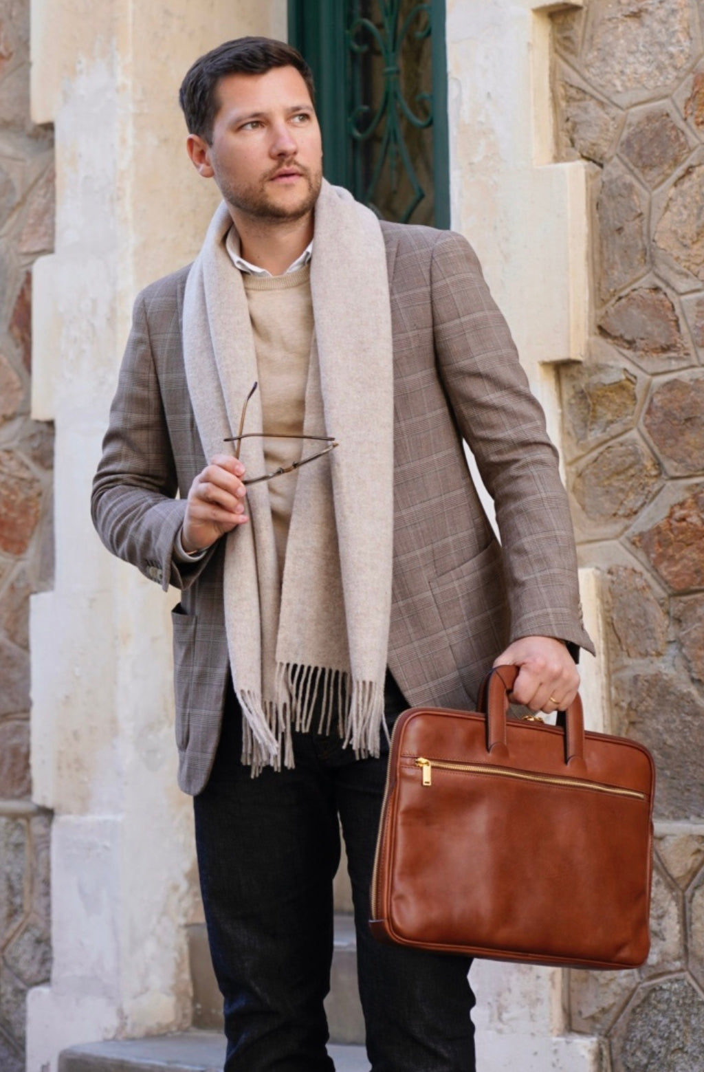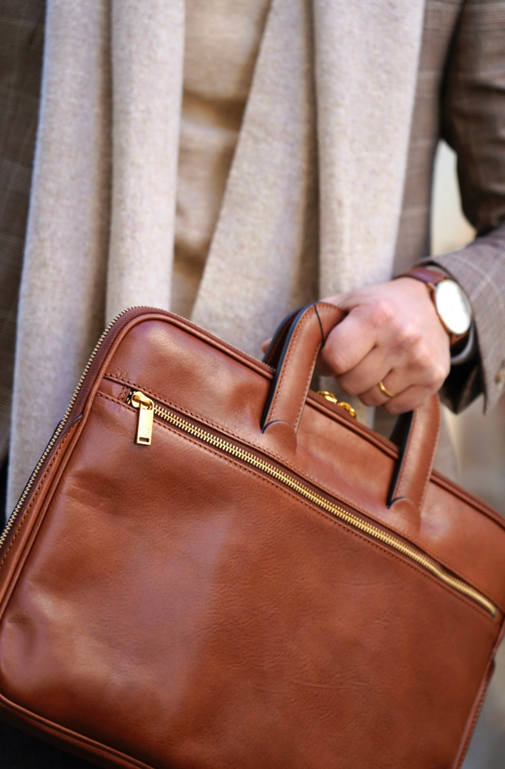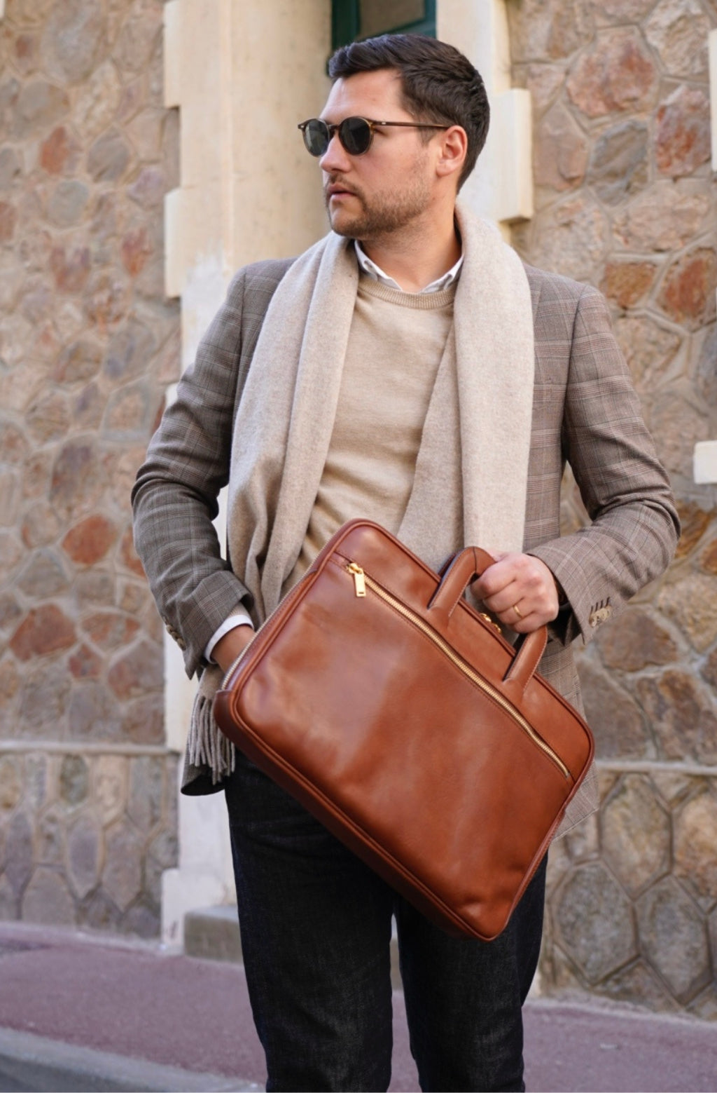 Een aktetas van volnerfleer die een perfecte harmonie uitstraalt tussen hard en zacht. Handgeverfd leer van topkwaliteit geeft een sentimenteel gevoel, maar de belijning straalt een lichte moderniteit uit. Tijdloos en actueel. Mannelijk en vrouwelijk. Stedelijke functionaliteit met charisma.
