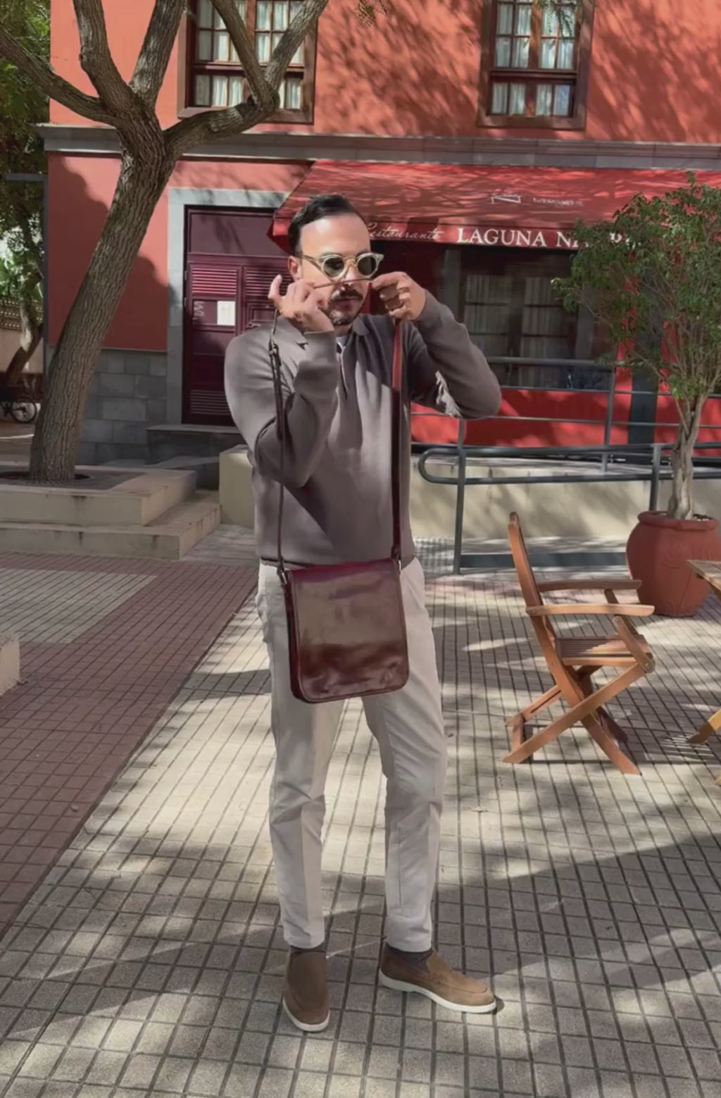 Een kleine leren messenger bag met een zorgeloze houding. Klassiek, licht en bescheiden, bij uitstek geschikt voor een vrije geest met gevoel voor avontuur en ontdekkingsdrang; iemand die elke dag opstaat met ogen vol verwondering, verwachtend dat het onverwachte achter elke hoek kan schuilen.