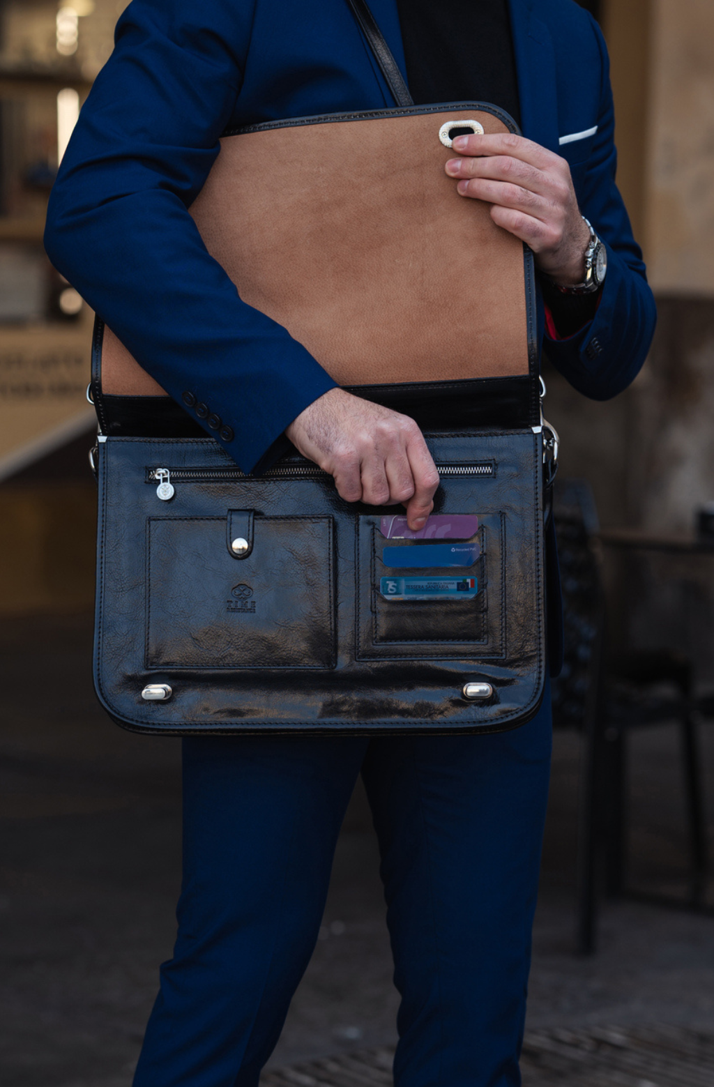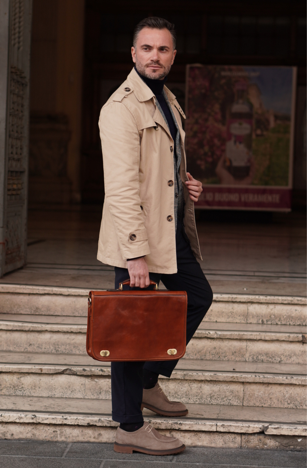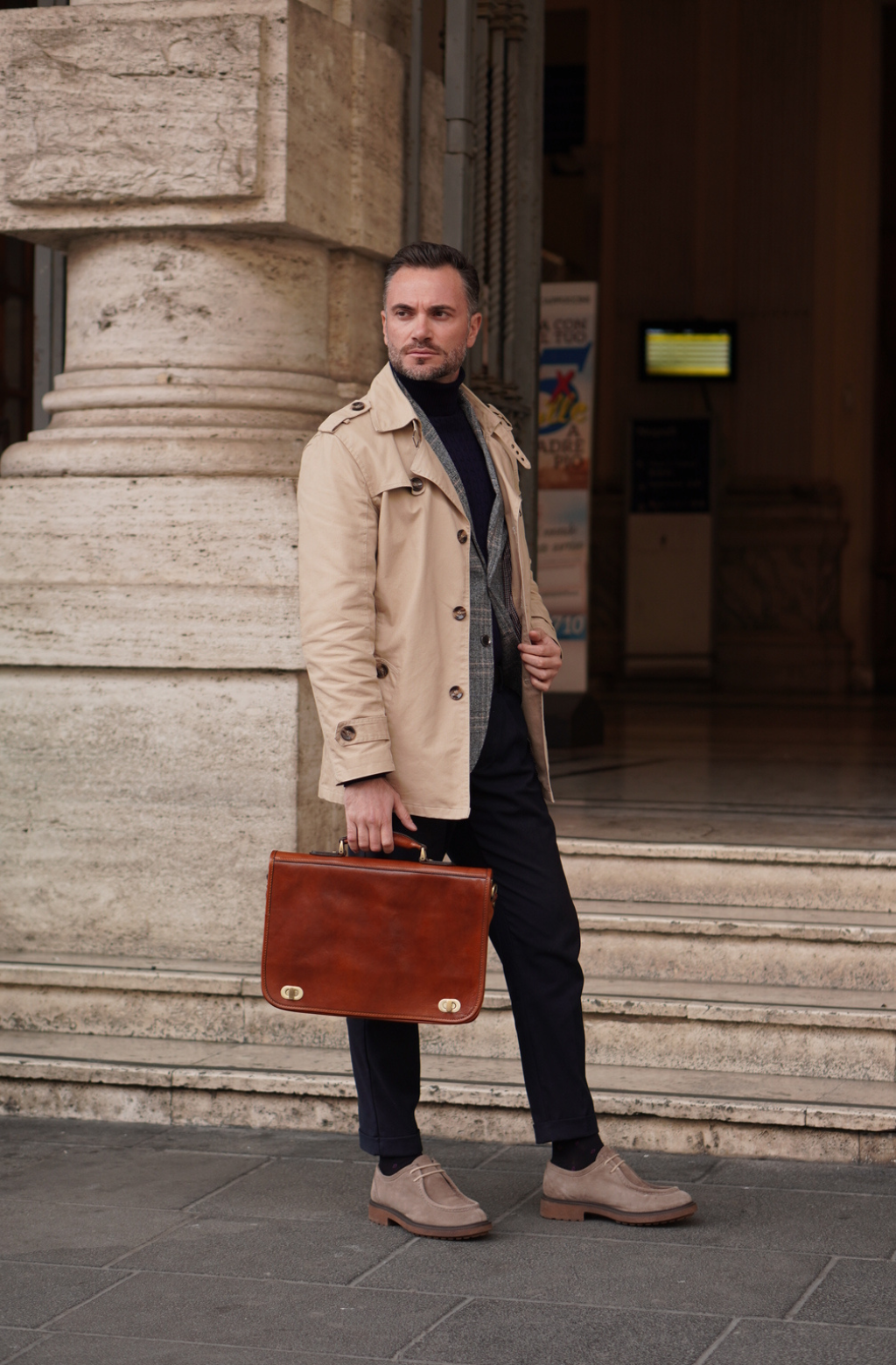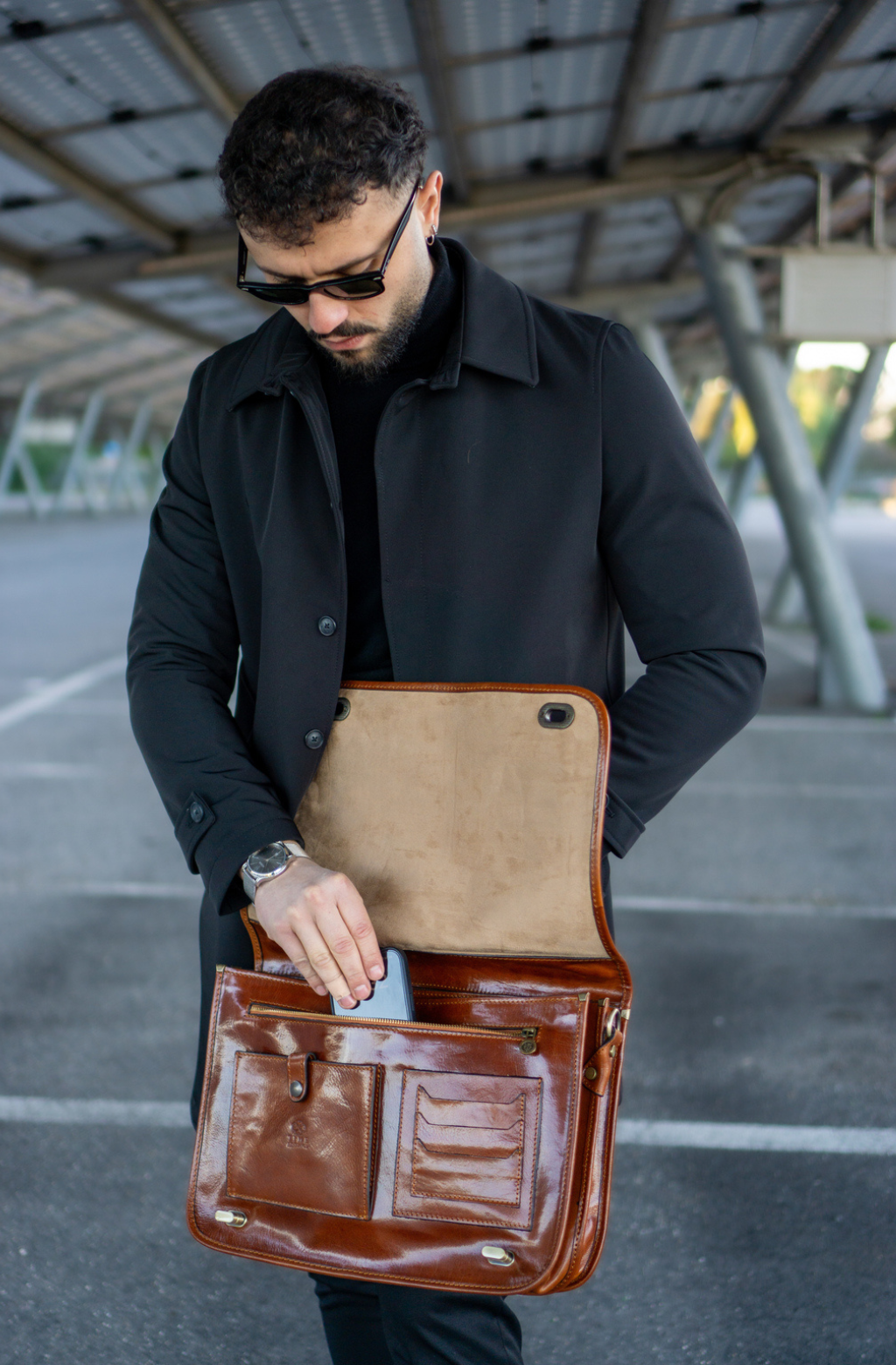 Formeel doch poëtisch. Een leren aktetas die dienst doet als brug tussen twee werelden – in staat om een artistiek accent toe te voegen aan zakelijke kleding of om casual kleding een formele glans te geven. Voor iemand die manoeuvreert tussen creatief en zakelijk. Gaat gepaard met een geest van heruitvinding.