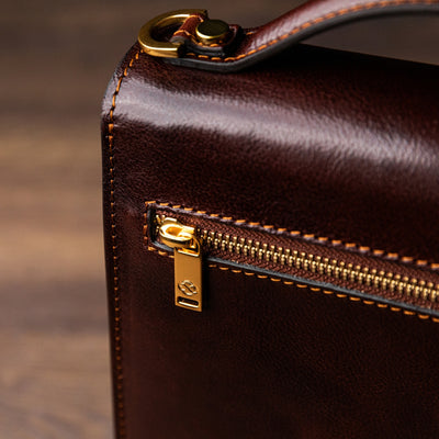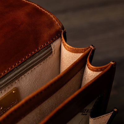 Time Resistance werkt met Italiaans Vachetta-volnerfleer: plantaardig gelooid en met de hand geverfd. Het ontwikkelt een rijke, elegante patina.